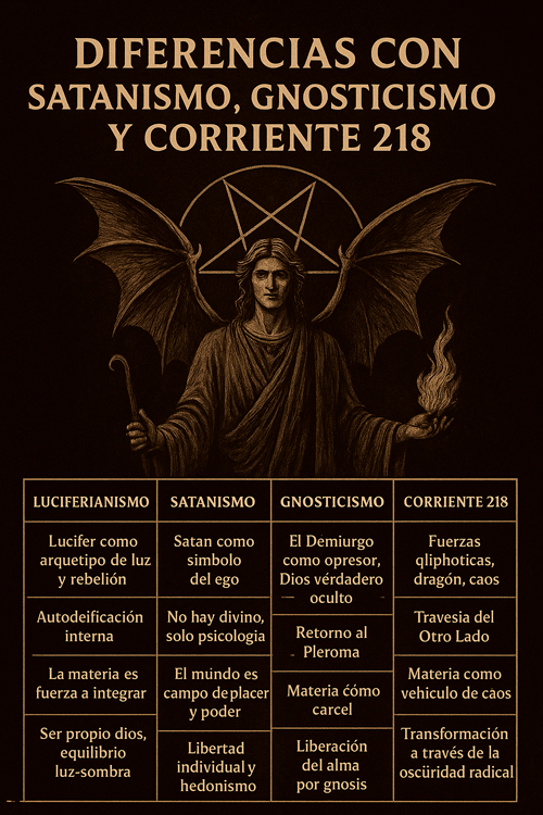El estudio de las corrientes ocultistas y espirituales que giran en torno a figuras como Lucifer, Satán, o conceptos como la gnosis y las vías de iniciación modernas, exige una mirada profunda y comparativa. Aunque a primera vista muchas de estas tradiciones parecen compartir símbolos o nombres similares, la verdad es que cada una encarna una cosmovisión distinta, con objetivos, métodos y fundamentos filosóficos únicos.En este artículo exploraremos las diferencias y puntos de encuentro entre el Luciferianismo, el Satanismo, el Gnosticismo y la Corriente 218, de manera que el lector pueda comprender dónde se separan y cómo pueden entrelazarse en la práctica contemporánea.1. El Luciferianismo: la senda del portador de luzEl Luciferianismo es más que una religión o filosofía: es un camino iniciático que reconoce en Lucifer al símbolo de la iluminación, el despertar, la rebelión contra la ignorancia y la afirmación de la voluntad individual.Rasgos principales del Luciferianismo: Lucifer no es adorado como un dios externo, sino invocado como un arquetipo interno que inspira el ascenso espiritual. Busca el equilibrio entre luz y sombra, entendiendo que el autodescubrimiento surge al integrar ambas fuerzas. Su finalidad es la apoteosis personal, es decir, la transformación del ser humano en un ser autodeterminado, sabio y libre de dogmas. Es un sistema sincrético, que toma elementos de tradiciones mesopotámicas, gnósticas, helenísticas y de la magia ceremonial. Práctica central: rituales de autodeificación, meditación en arquetipos luciferinos, y desarrollo de una ética de libertad responsable. El Luciferianismo es un camino solitario y elitista en el sentido de que exige disciplina, reflexión y construcción personal, más que pertenecer a una comunidad estructurada.2. El Satanismo: entre el Ateísmo y lo TeístaEl Satanismo es a menudo confundido con el Luciferianismo, pero sus raíces y propósitos son diferentes. Existen varias formas de satanismo, de las cuales destacan dos grandes vertientes: el Satanismo Ateo (LaVeyano) y el Satanismo Teísta.2.1. El Satanismo Ateo (LaVeyano) Fundado oficialmente en 1966 por Anton LaVey con la publicación de La Biblia Satánica. Considera a Satán un símbolo, no una deidad. Representa el ego, el placer, la individualidad y la oposición al dogma cristiano. Es un sistema materialista y ateo: no hay magia sobrenatural, sino psicodrama ritual para liberar emociones y reforzar la voluntad. Su ética se basa en el individualismo radical, el hedonismo responsable y la autodefensa. 2.2. El Satanismo Teísta A diferencia del laVeyano, aquí Satán es concebido como una entidad real y se establecen lazos devocionales con él. Busca un pacto personal con el Adversario, viéndolo como maestro y liberador espiritual. A veces se entrelaza con corrientes oscurantistas, magia negra y cultos más tradicionales. Diferencias con el Luciferianismo El Luciferianismo busca trascendencia espiritual, mientras que el Satanismo LaVeyano es más terrenal y hedonista. El Luciferianismo no reduce a Lucifer a mera oposición al cristianismo; en cambio, el Satanismo suele definirse en contraposición directa a lo cristiano. En el Satanismo Teísta, el énfasis está en la devoción externa a Satán, mientras que en el Luciferianismo está en la integración interna del arquetipo luciferino. 3. El Gnosticismo: la gnosis como salvaciónEl Gnosticismo es una corriente mucho más antigua que el Luciferianismo y el Satanismo, pero que comparte algunos puntos de contacto. Se originó en los primeros siglos de nuestra era, como una respuesta mística y filosófica al cristianismo ortodoxo.Rasgos del Gnosticismo El mundo material es visto como una prisión creada por el Demiurgo, un falso dios ignorante y tirano. El verdadero Dios es trascendente, y el alma humana posee una chispa divina atrapada en la carne. La gnosis (conocimiento espiritual) es el camino de liberación, que permite al alma escapar del ciclo material y volver al Pleroma (la plenitud divina). El mal no proviene del diablo, sino del Demiurgo y sus arcontes que mantienen al hombre en la ignorancia. Diferencias con el Luciferianismo En el Gnosticismo, la materia es una cárcel a superar; en el Luciferianismo, la materia y la sombra son fuerzas a integrar y transformar. El Gnosticismo busca retorno al origen divino, mientras que el Luciferianismo busca la auto-divinización aquí y ahora. El símbolo de Lucifer, como portador de luz y rebelde contra un dios opresor, a veces es reinterpretado en clave gnóstica, pero los caminos se diferencian en sus fines últimos. 4. La Corriente 218: el sendero del CaosLa llamada Corriente 218 es una de las más enigmáticas dentro del ocultismo contemporáneo. Nace de la obra de Thomas Karlsson y el grupo sueco Dragon Rouge, que mezcla Qliphoth, magia caótica y tradiciones del lado nocturno de la Kabbalah.Rasgos de la Corriente 218 El número 218 hace referencia a la vibración numérica de ciertos mantras ligados al Qliphoth, el “lado oscuro del Árbol de la Vida” en la Kabbalah. Es un camino antinomiano y caótico, que busca sumergirse en la oscuridad para alcanzar un despertar radical. Usa mitología draconiana, el culto a Lilith, Samael y a los poderes de la Sitra Ahra (el “Otro Lado”). A diferencia del Luciferianismo, no busca integrar luz y sombra, sino profundizar en la senda oscura como catalizador de transformación. Diferencias con el Luciferianismo El Luciferianismo busca equilibrio y autodeificación armónica; la Corriente 218 es más destructiva, enfocada en atravesar el Caos. La Corriente 218 tiene un marco ritual más kabbalístico y qliphótico, mientras que el Luciferianismo es más abierto y sincrético. El Luciferianismo reconoce a Lucifer como guía-arquetipo; la Corriente 218 trabaja con una pluralidad de entidades caóticas. 5. Comparación finalCorrienteFigura centralRelación con lo divinoVisión de la materiaObjetivo espirit